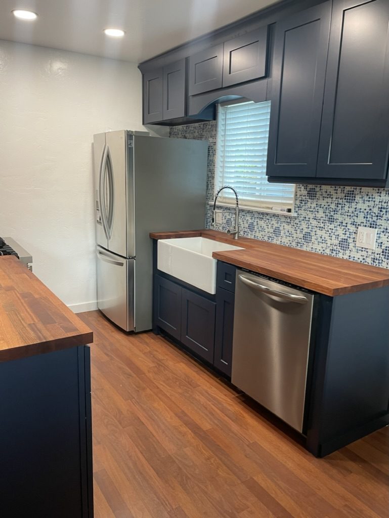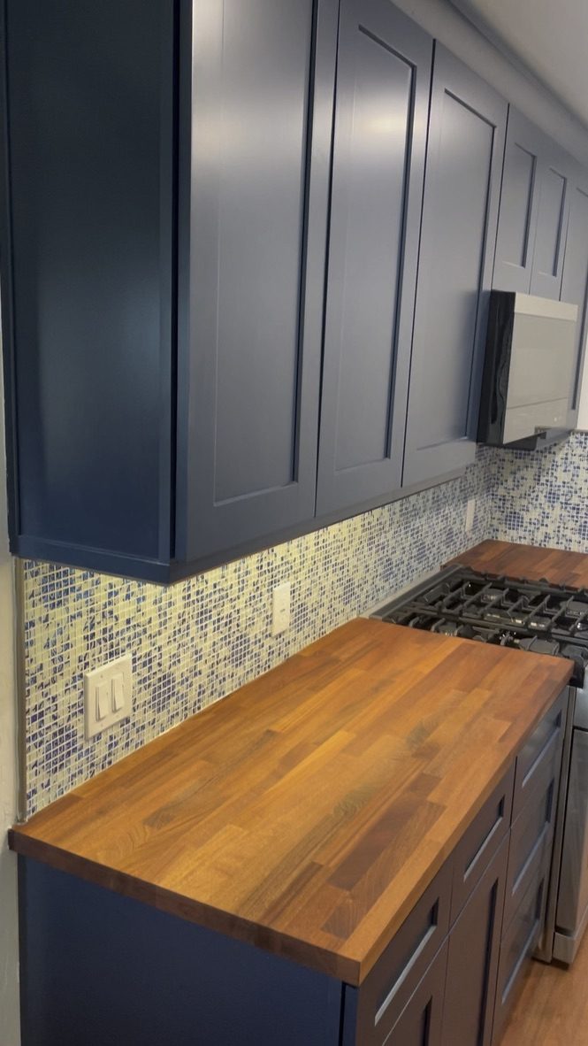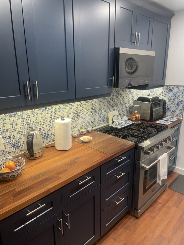 A full kitchen remodel with navy shaker cabinets, butcher block countertops, mosaic tile backsplash, and stainless steel appliances in a charming coastal home.