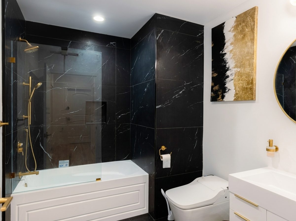 A condo bathroom renovation featuring matte black fixtures, floating vanity, and contemporary tile work — all completed within HOA guidelines.